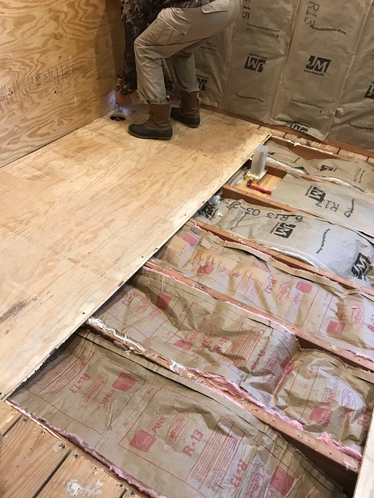 So, Tom has been working on the Master bath. The plumber did finally come back Saturday, December 19 and I guess he plumbed. Then, Tom had a part to do involving the insulation and the subfloor. There was a lot of cussing involved and I asked Tom if he thought the subfloor was sub-par and he wasn’t amused.