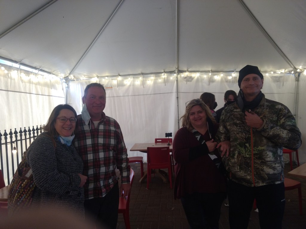 Then, we sat at two patio tables in a tent next to each other at a nearby burger place. They claim to have invented the cheeseburger? I had a hot buttered rum!