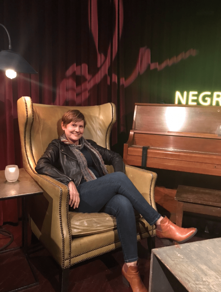 And, here is Beth when we ate at a speakeasy. We took pictures of each other on this stage.