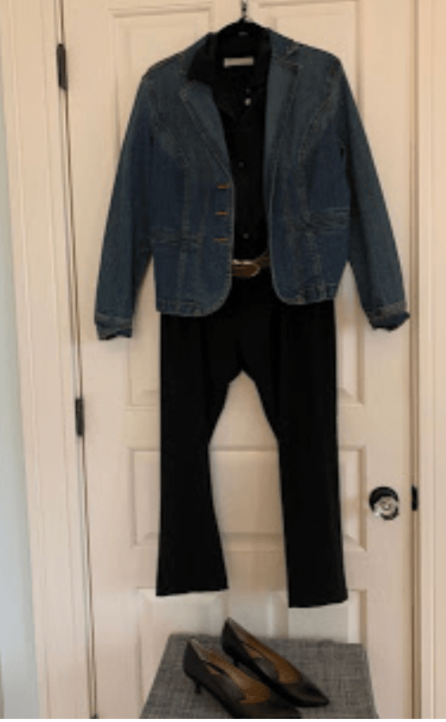 Here are some examples of contrasting the feel of the pieces to get something a bit more interesting. In the first, the shirt is casual and cotton with a military vibe. I styled it with tailored wool pants, a fancy belt, and lady-like kitten heels. In the second, black silk shirt, tailored pants, but topped with a faded vintage denim blazer.