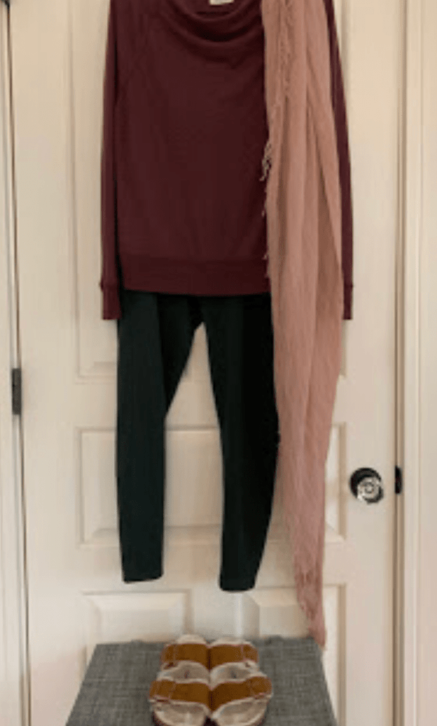 I have always been a jeans girl/woman; and have not really bought into the athleisure craze. I am very active and exercise a lot, but I prefer to keep my exercise clothes separate from my everyday look, you know? However, the pandemic and resulting at-home life has resulted in the embracing of some of this look. I bought two pairs of leggings and two tops from Prana. Here, I have the outfit styled with my super-comfy fuzzy Birks, and a lightweight scarf.