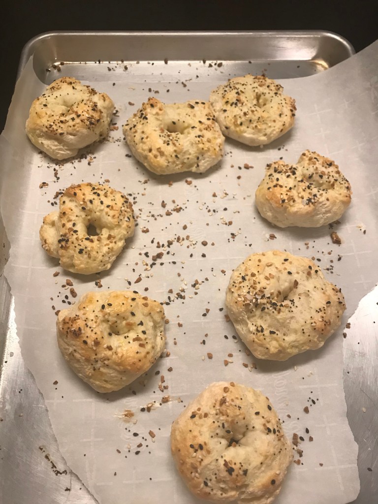 So, in that vein, I made the famous two ingredient bagels that involve self-rising flours, Greek non-fat yogurt, a bit of egg wash, and the everything but the bagel seasoning.