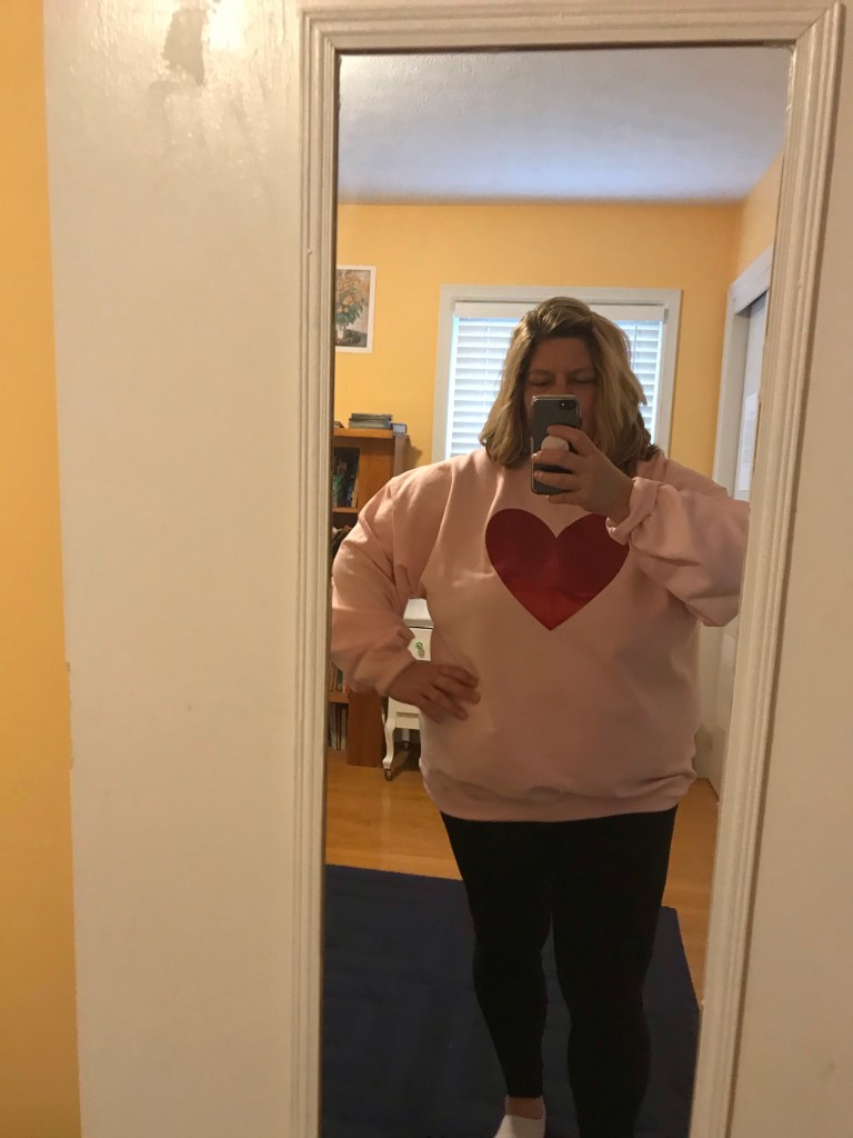 Then, I got to see two former students (while both of us wore masks, of course!) – one has started a graphic tee/sweatshirt business and I custom ordered this giant red metallic heart on a pink sweatshirt. She is now a teacher at another local high school and we talked for a good hour when I picked up my sweatshirt from her house.