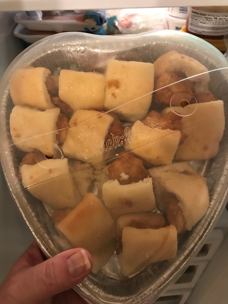 I also picked up a heart shaped tray of chicken minis Saturday morning. I met a friend at Trader Joe’s to try to show her the ropes and CFA was close by so I thought why not?