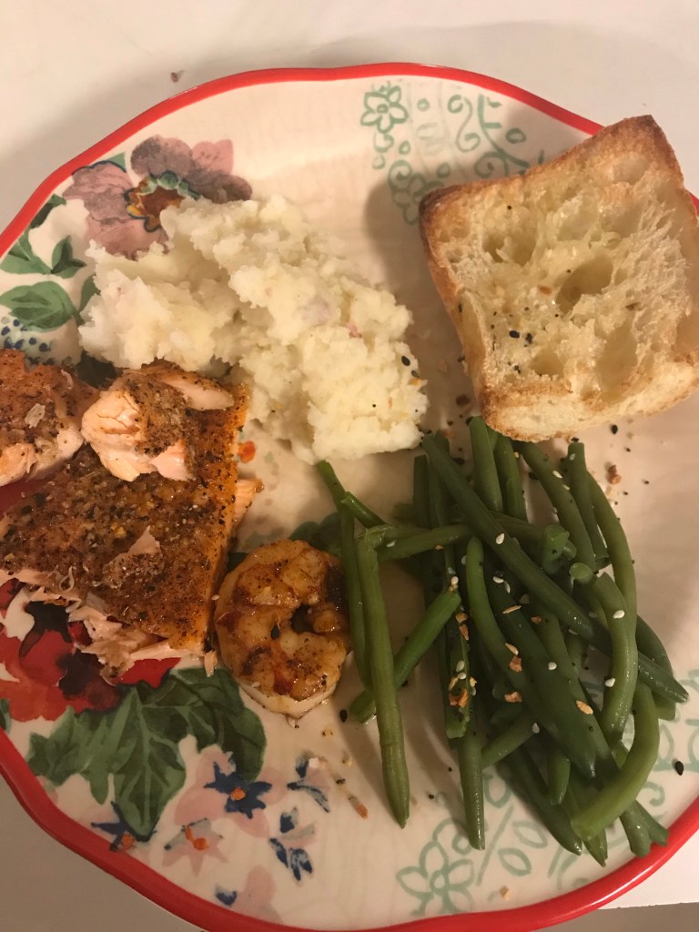 Saturday night we had salmon, shrimp, green beans, mashed potatoes, and bread made by me.