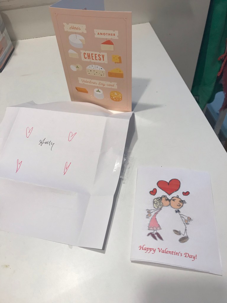 We did cards. Tom almost always makes mine. He chose a template that can’t even spell Valentine correctly so I had fun with that!