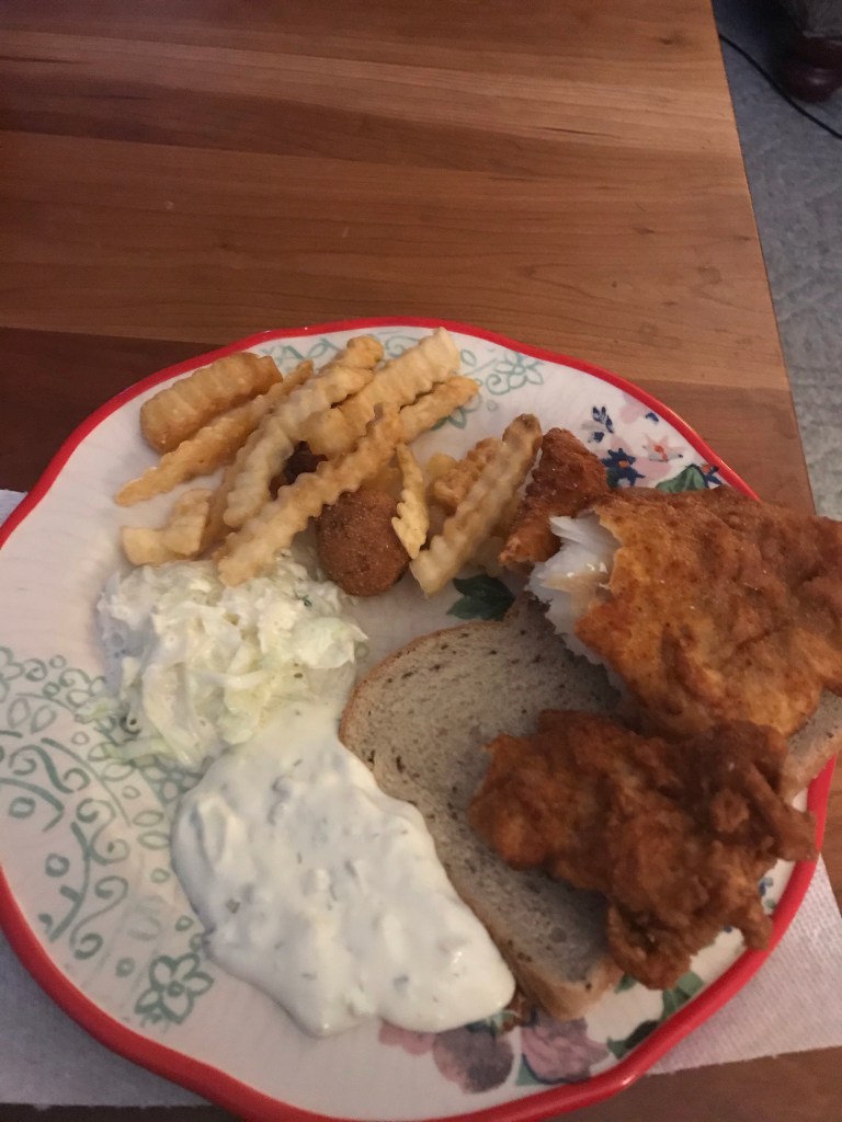 Friday night, Tom and I got in on the Friday night fish for Lent. This is half a portion and I am so glad we split.