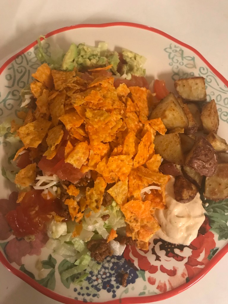 For dinner, it was Tom, Mason, and I. I made Mexican potatoes and an 80s Doritos taco salad. It was good!