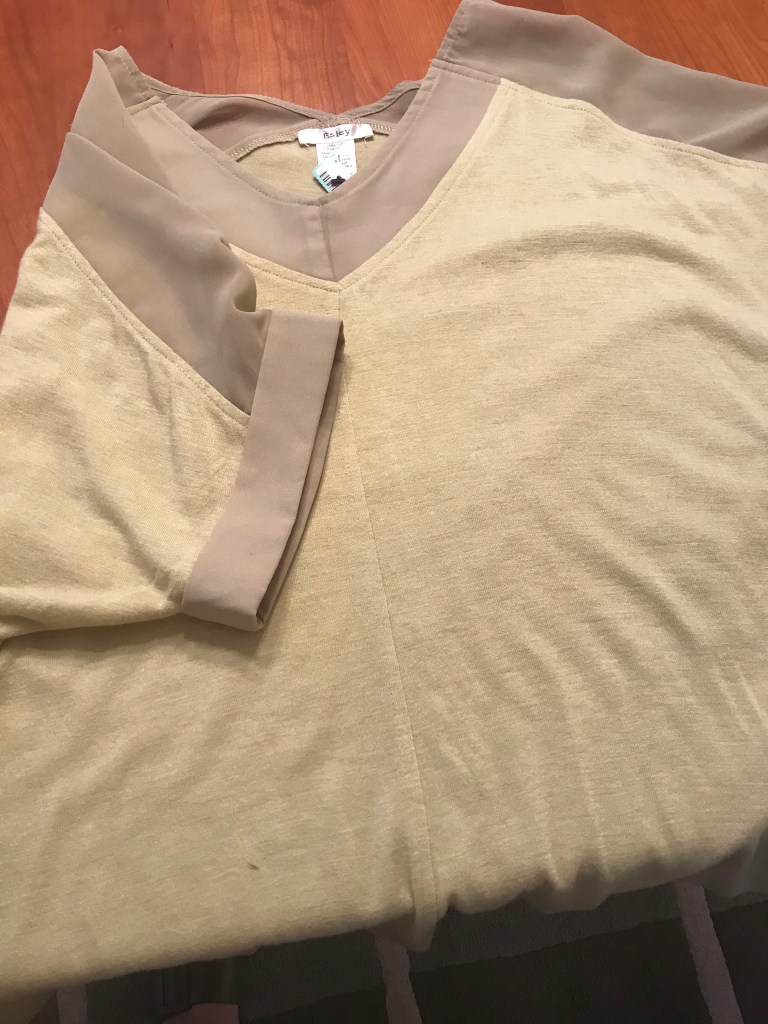 This shirt was another of my sister’s finds. It is a pale green mossy color and it looked very flattering on her. Lesson here is that it may not look like much on the hanger, but it might be really great if you try it on. I told her I thought she would reach for this a lot. Elevated t-shirts are what I call this type of thing and they are really great to have in your wardrobe.