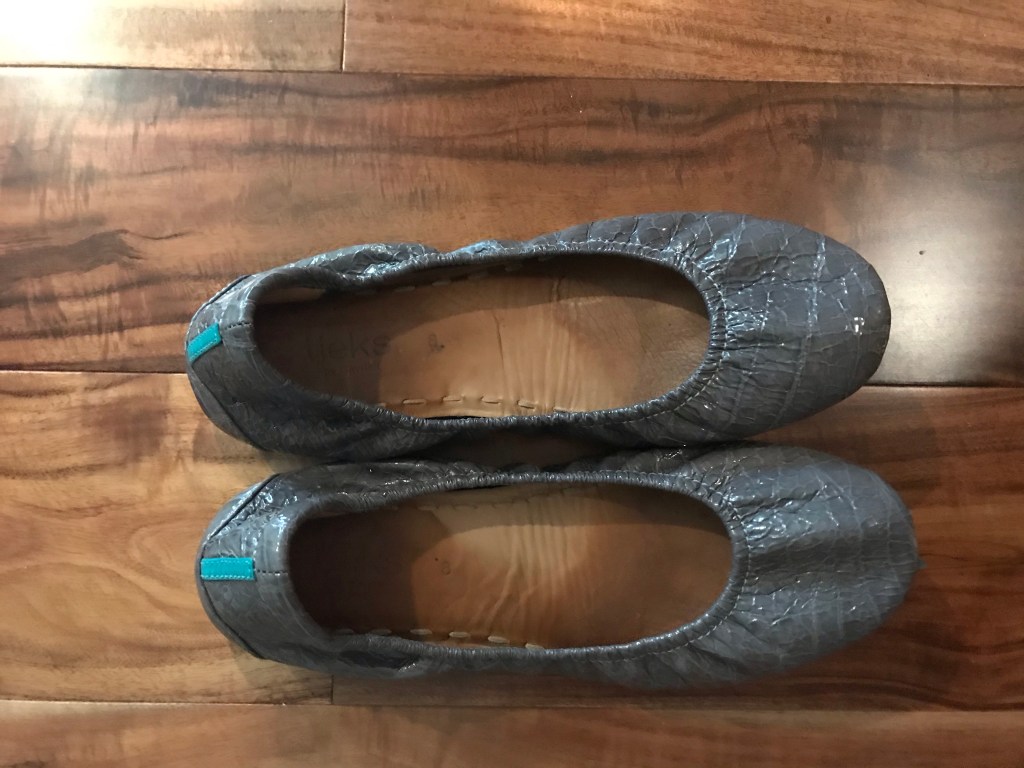 After taking the gold ones home, I couldn’t stop thinking about the grey below and the plain black (not pictured). I went back and scooped them both up before they could be sold. So, for $90, I have $600 worth of Tieks. I love these flats. I have worn them a bunch to teach in.
