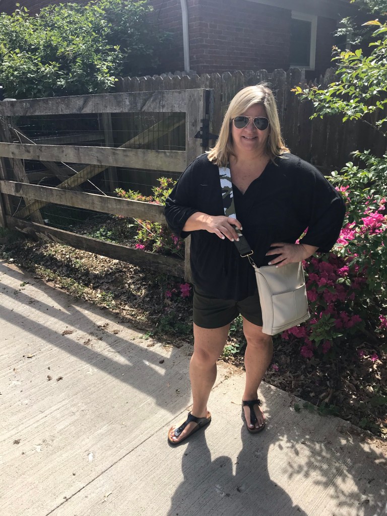 These are my Target shorts I have talked about. They have pockets and I love the material. I “collect” black tops with interesting details. They work with other solids and they work with my patterned pants and skirts. This is a knit boho top from Old Navy from last year. My camo purse strap works well with this color combo, I think.