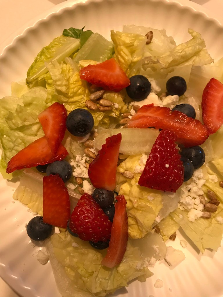 I made this red, white, and blue salad for Friday night dinner along with salmon, broccoli, and potatoes. I did romaine, blueberries, strawberries, sunflower seeds, and feta. I used Brianna’s brand dressing. Yum!
