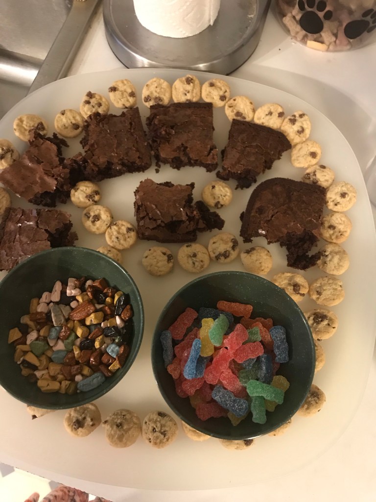Saturday our boys had 3 friends over and they played games in the basement. It made me so happy and I made two platters to be silly. This one had homemade brownies, little cookies from Trader Joe’s, Sour Patch kids, and chocolate rocks that I get from Paul’s Fruit Market.