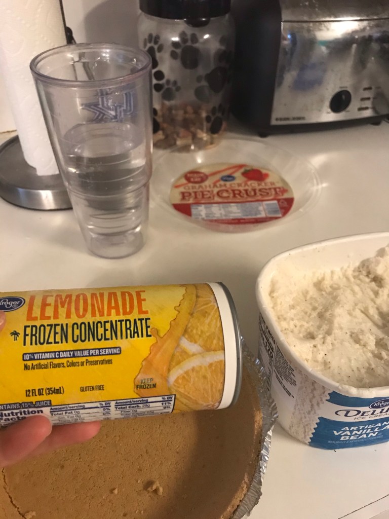 Sunday morning I did a Kroger run and then made the lemonade pie. This is the first one of the season! This is a recipe from my Aunt Sally – mix about half of a frozen lemonade canister with about 1/4 gallon vanilla ice cream. Stir until it’s melted together and pour into the crust. It works best if you let it freeze an entire 24 hours before serving. Yum!