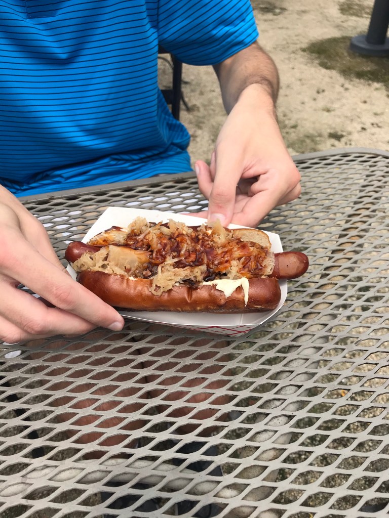 Hooks (our new friend) had a gourmet hot dog.
