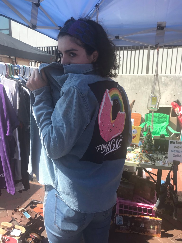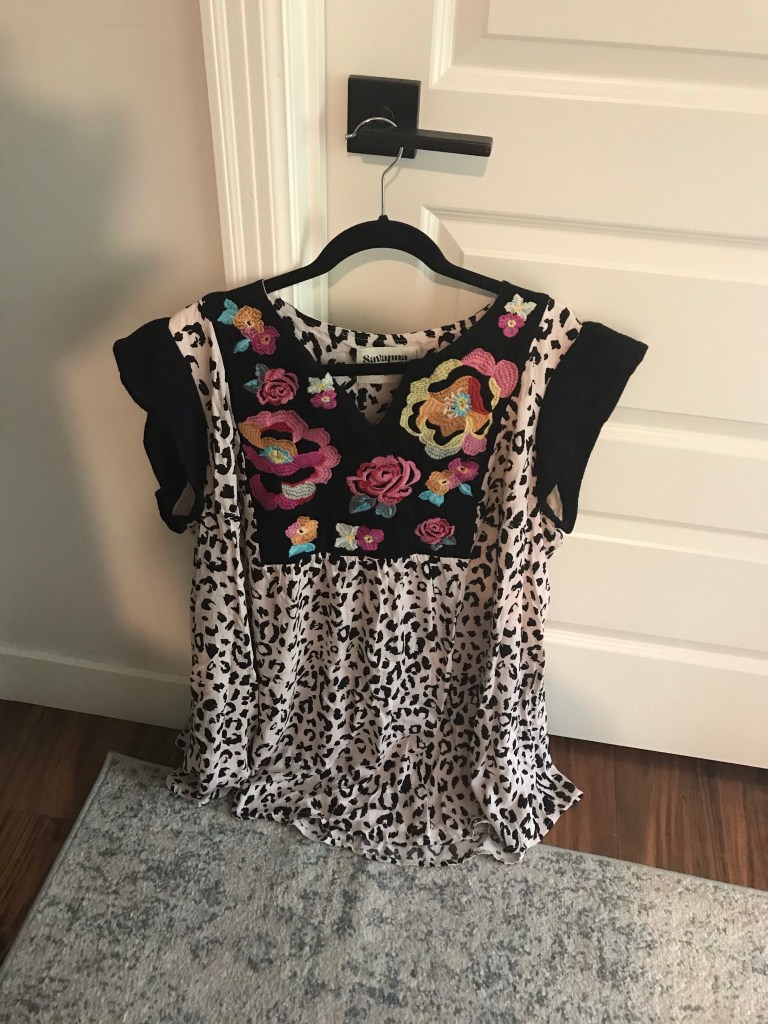 She found this cute button down with a t-shirt square sewn on the back.