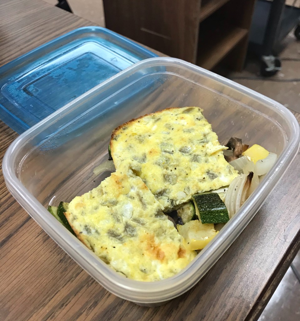 -veggies (zucchini, onion, mushrooms) with a square of low carb egg casserole