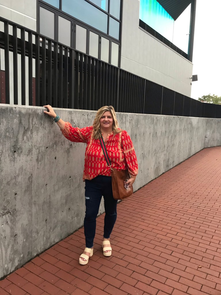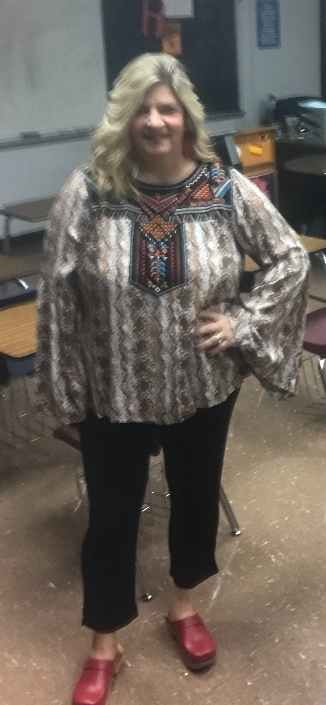 Thursday I wore my newish TJ Maxx top. I love the print, but the material is weird and a bit hot. I knew better than to accept a not perfect material. The skirt is LulaRoe and handed down from a co-worker and I wore my metallic clogs. I felt great in this but I think it looks frumpy. I don’t know that a 5’4 person can pull off a long skirt. I look tired and I am still having the issue of fuzzy pictures.