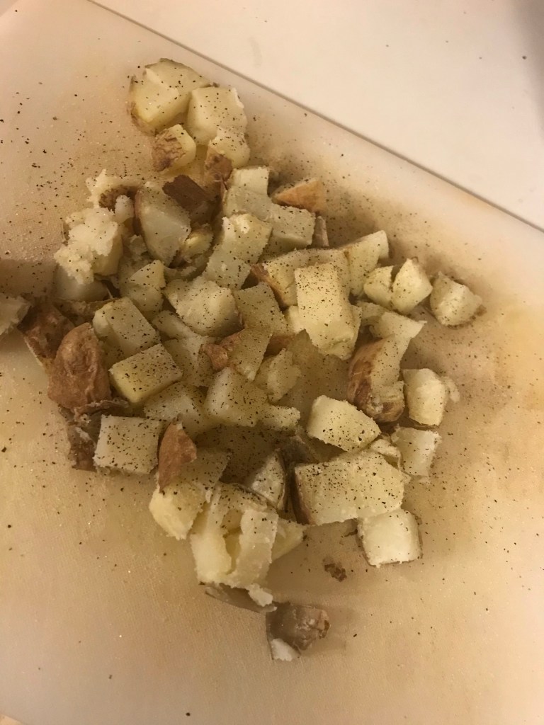 Salt and pepper your potato chunks.