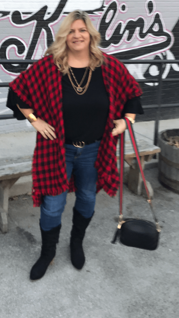 For a dinner out, I wore this outfit – Target boots, jeans, old black blouse, and an old poncho.