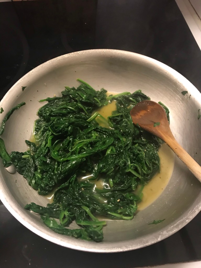 You can use frozen spinach but I used fresh. I used the whole bag – it cooks down so much! I added some chicken broth, garlic powder, and pepper.