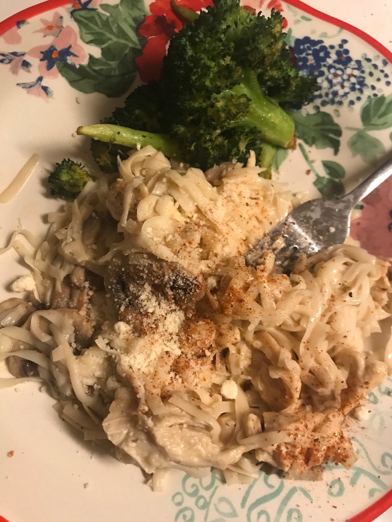 I really like these noodles. I got mine at Costco. I made my sauce from one laughing cow wedge and chicken broth and it was delish! I whisked them together and heated them on the stove top. I added some garlic powder and cajun seasoning. I also added mushrooms to Tom’s portion and mine.
