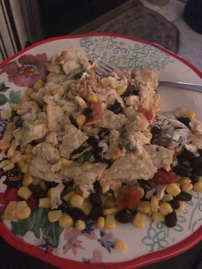 Ewww…apologies for this photo! I use chicken tenders, a bit of seasonings, and a bit of water, and a whole jug of chicken broth. It shreds beautifully for your recipes and tastes just as flavorful as a rotisserie chicken from the grocery; you don’t have to get all messy!
