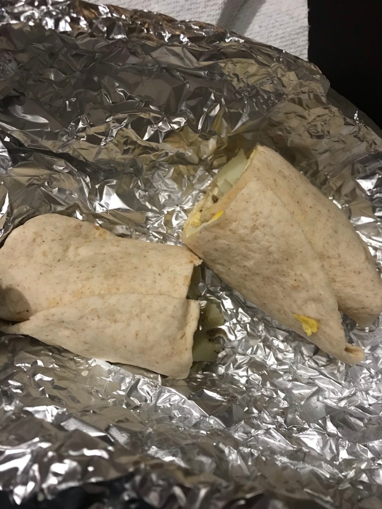 I use a low carb tortilla (this time it was whole wheat), an egg fried or scrambled, a tiny bit of shredded Mexican cheese, and a few pieces of diced potato. I heat in my classroom microwave for about 30 seconds. This is 2 WW points.