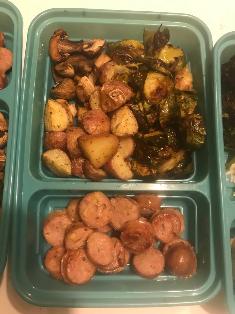 This week I made chicken sausage, brussel sprouts, mushrooms, and potatoes: