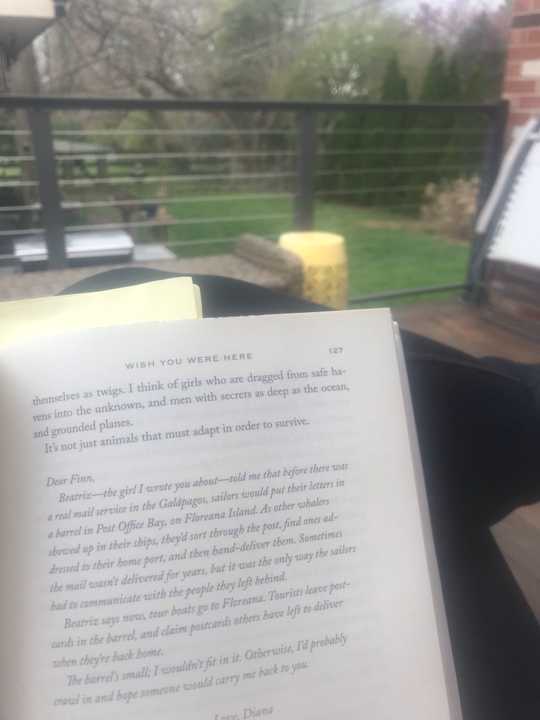 Even though we were experiencing Second Winter, I read outside for a bit until it started raining. I am in deep with my book Wish you Were Here by Jodi Piccoult.
