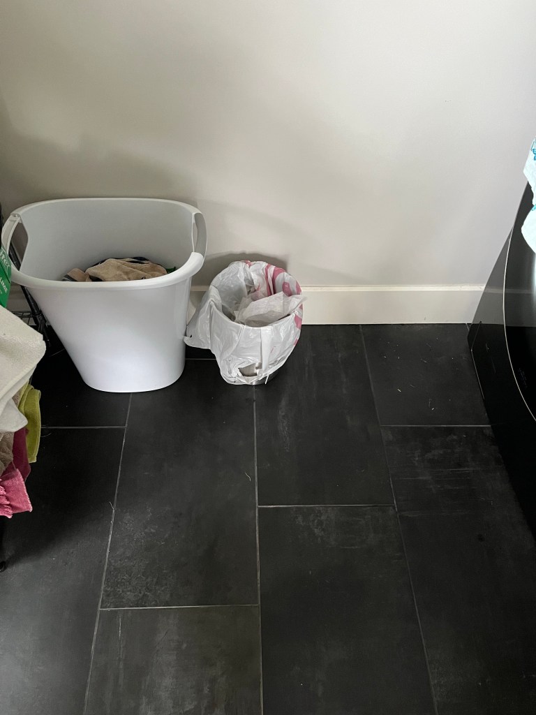I enjoy mopping my new mudroom floor. I also love that I repurposed old trashcans for a new use. The one on the left is for dirty dish towels and the one on the right is for lint and dryer sheets. I realized I needed a trashcan near the dryer for these things.