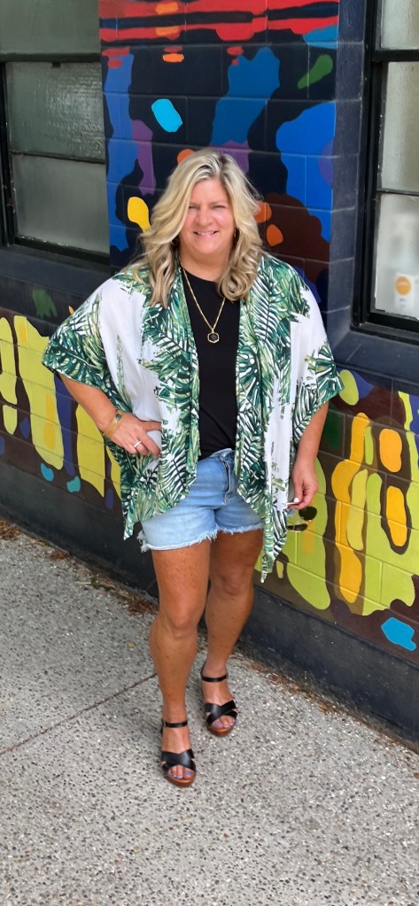 I wanted to try a “lewk” here. I wore my newish Amazon Cushionaire (lookalikes for MIA brand) clog sandals, my old Target Universal Thread cut offs, a target tank, and an old Nordstrom palm print kimono to go to lunch. I realized the kimono had a rip in it (and I had another kimono with a rip – is this a pattern for me?), so I took both of them to my tailor this week. I love getting clothing repaired because I feel like I’m making an item new again. I do consider the cost involved and try to ask myself if I would buy the item again today. I love this kimono and I think by tucking in the bottom tank it looks more flattering – maybe? I was trying to shy away from more voluminous clothing, but I really like the kimono shorts look and I hope it’s still on trend!