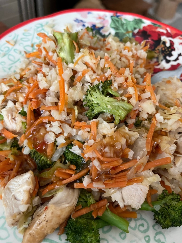 Friday was a rainy and stormy day so I didn’t do the errands I needed to do. It was a good day to stay home. For dinner, I made this bowl again for the whole family. I don’t have a recipe – it’s just grilled chicken, broccoli, cauliflower rice, shredded carrots and thai sweet ginger sauce.