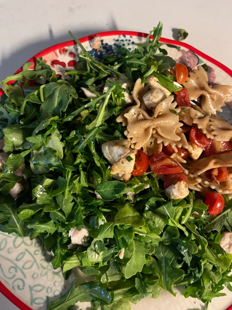 I made myself a lunch one day this week from some arugula that I bought and needed to use and some pasta salad I made this weekend. So, the arugula was just covered in a dressing I made up with olive oil, lemon juice, and some spices and then I put the pasta salad next to it and added grilled chicken.