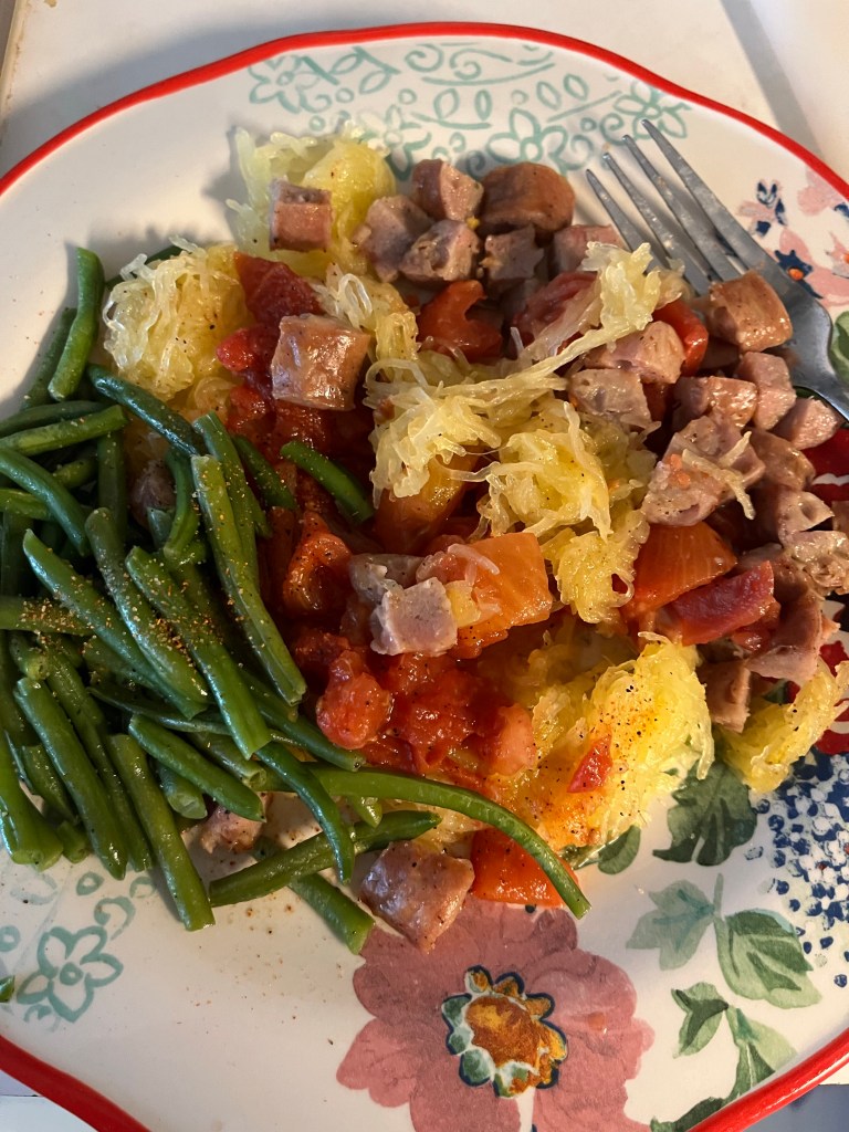 I had a really good lunch another day. Did you read my cajun bowl idea? I roasted a spaghetti squash and then used the leftover diced tomatoes and turkey sausage and green beans and added lots of cajun seasoning and this was delish!