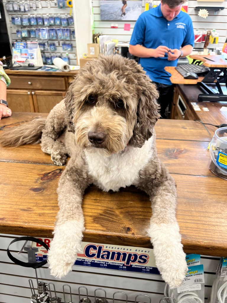 We took Ernie swimming and visited the marine shop, Marine Sales and Service. The dog River works the counter. She is hilarious and keeps touching you with her paw. She is better at customer service than some of the sales people we encountered at other shops!