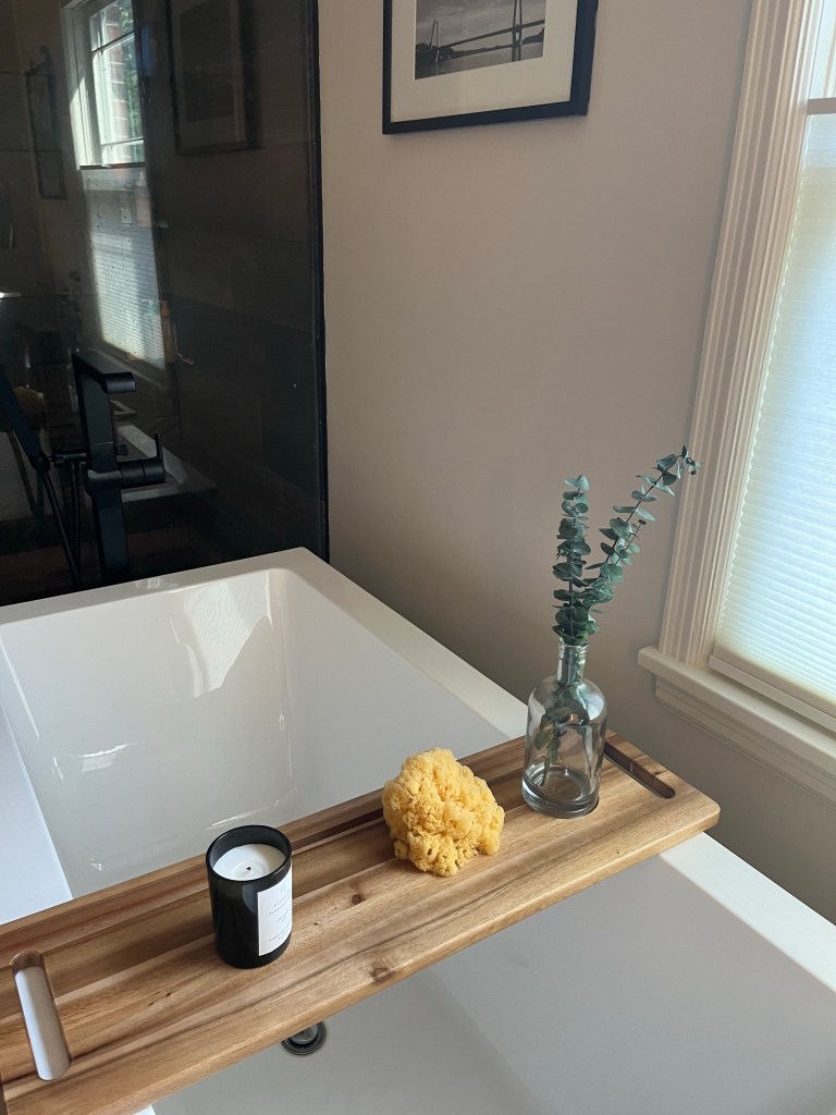 I absolutely love the bath tray and sponge that Elizabeth gave me for my 50th birthday. She is a really good gift giver. I picked the candle out at Target. Tom thought it was a bathtub charcuterie tray and I think he’s on to something. Who wouldn’t want to eat meat and cheese while relaxing in a tub?