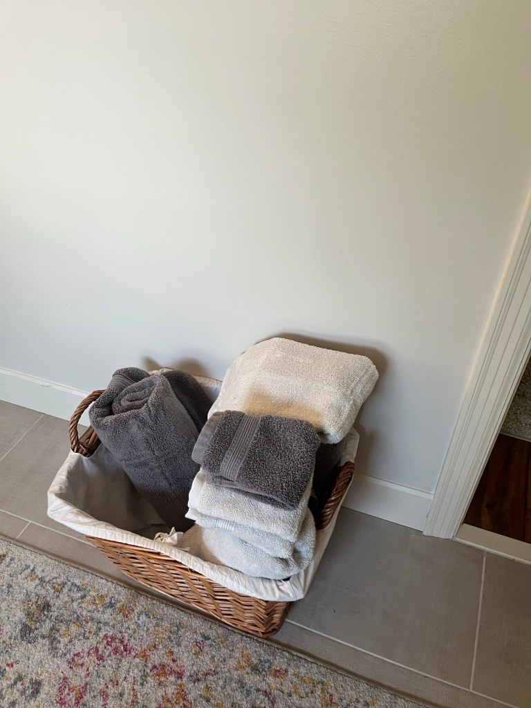 This was Tom’s old towel basket from his old bathroom. I love the towels I picked from Costco. One of my readers suggested Costco for towels – duh! I don’t know why I didn’t look there first. And, another reader suggested going with two different colors, so I picked a super light grey and a dark grey.