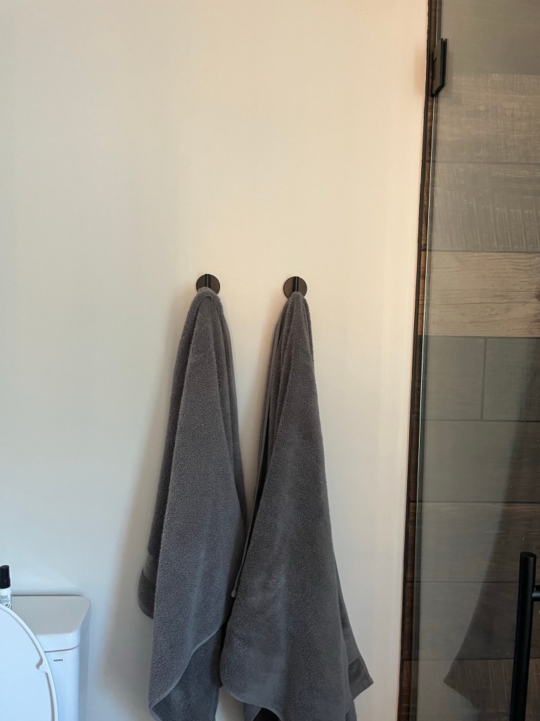 We didn’t really have room for a towel bar, and again, Tom doesn’t love messing up walls too much. Erica suggested hooks and I shared that idea with Tom and he actually approved! Tom is very picky about design fixtures if you haven’t guessed. He has worked in commercial construction with some upscale home consruction thrown in there and he likes what he likes.