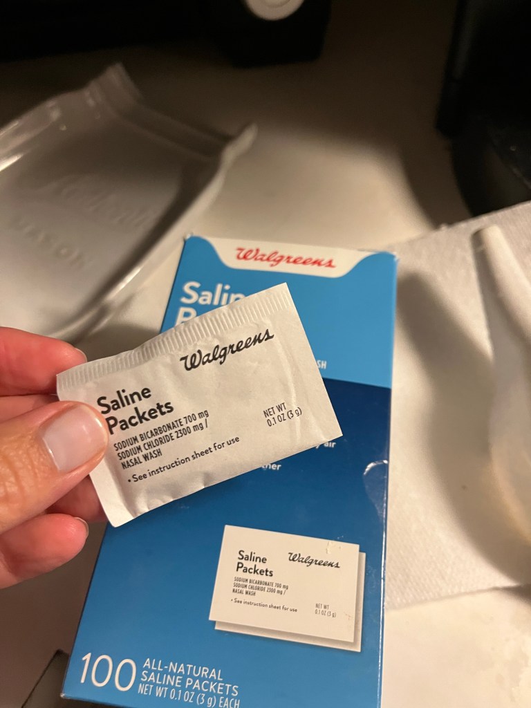 I swear that I think this little contraption cuts my congestion in half. If I would have been congested for 4 days, I am only congested for 2 days. We do it in the shower because it is less messy that way. You put a saline packet in the pot and then pour in warmed up distilled water. You pour the teapot into one nostril and then the other back and forth until your pot is empty. Sorry I said “we” so much. We definitely do not neti together; this is a solitary endeavor when one of us is sick.