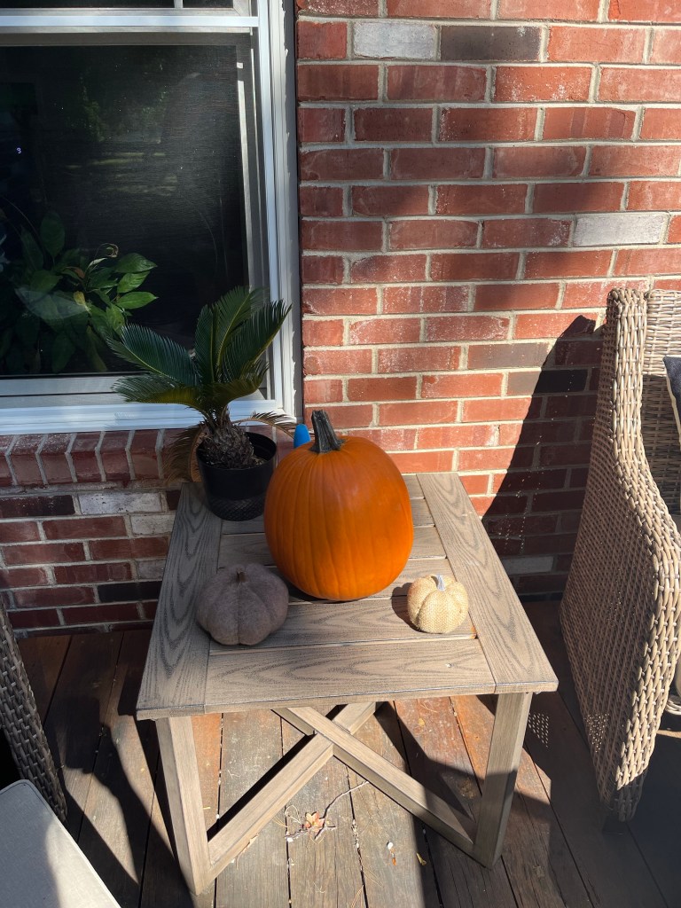 I love to decorate a bit on my front porch. I have Jack O’Lantern lanterns from Target years ago and I have a pumpkin flag. I also have a haunted house flag that I may change to in October. I have a very small front porch so I don’t do much at all.