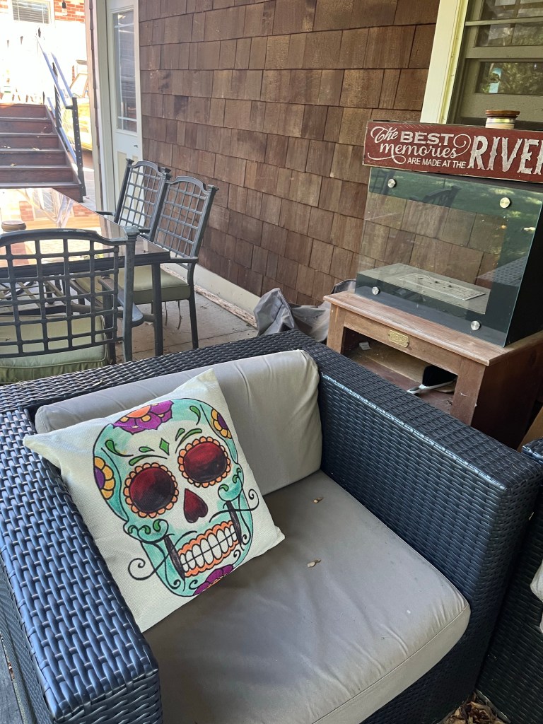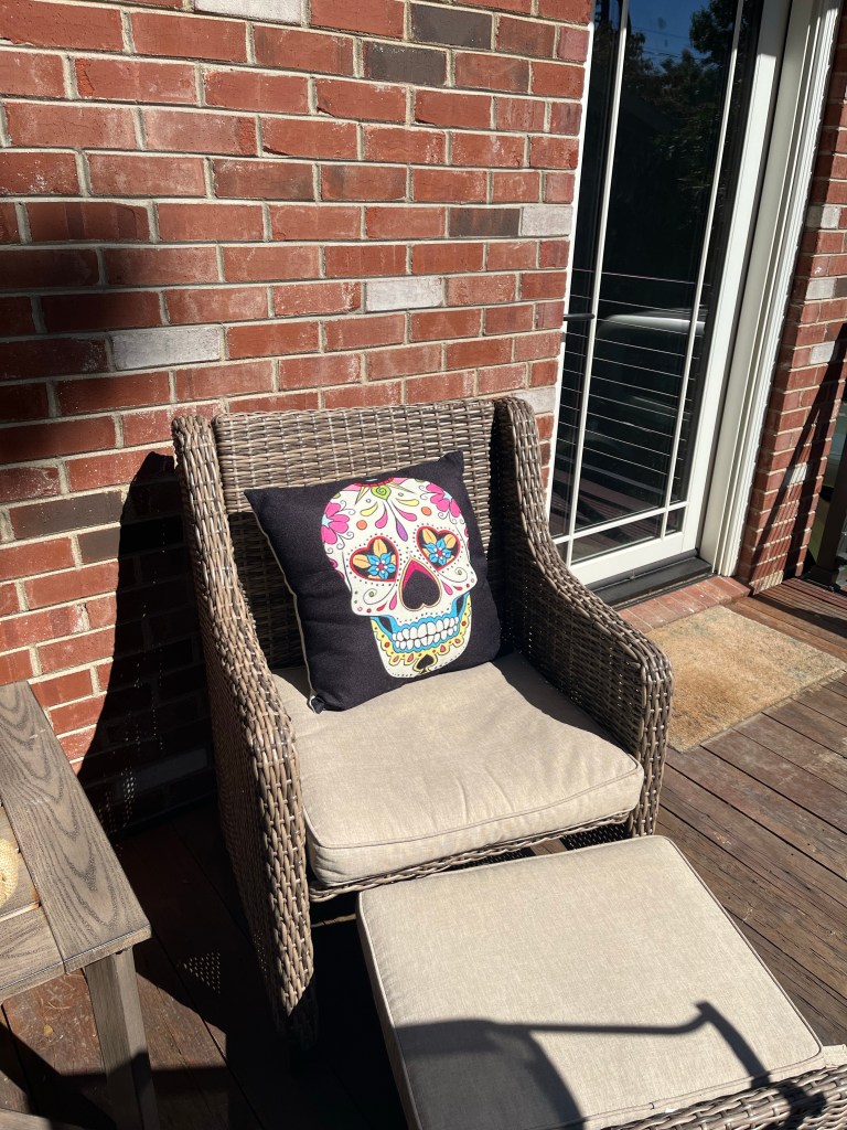I have Day of the Dead pillows from last year so I decked out both patios with these.