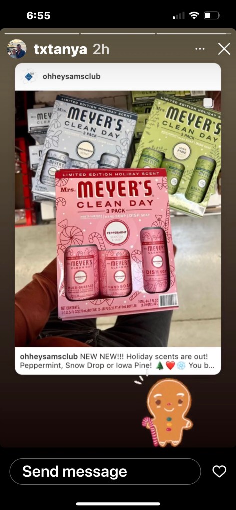 Thank you, Tanya, for posting this. I don’t belong to Sam’s, but it reminded me that I have to get the peppermint next. I am currently using Mrs. Meyer’s acorn spice and I love it!