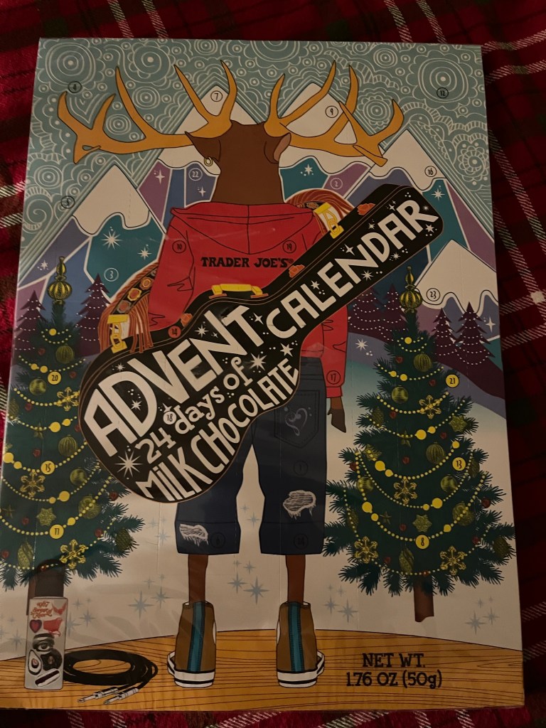 I sent my kids back to college with a Trader Joe’s 99cent chocolate advent calendar. They chuckled. I don’t think I had gotten them one the last two years of college. I always get them for all my nieces and nephews and give them to them at Thanksgiving. I got the guitar version especially for Jack who plays guitar.