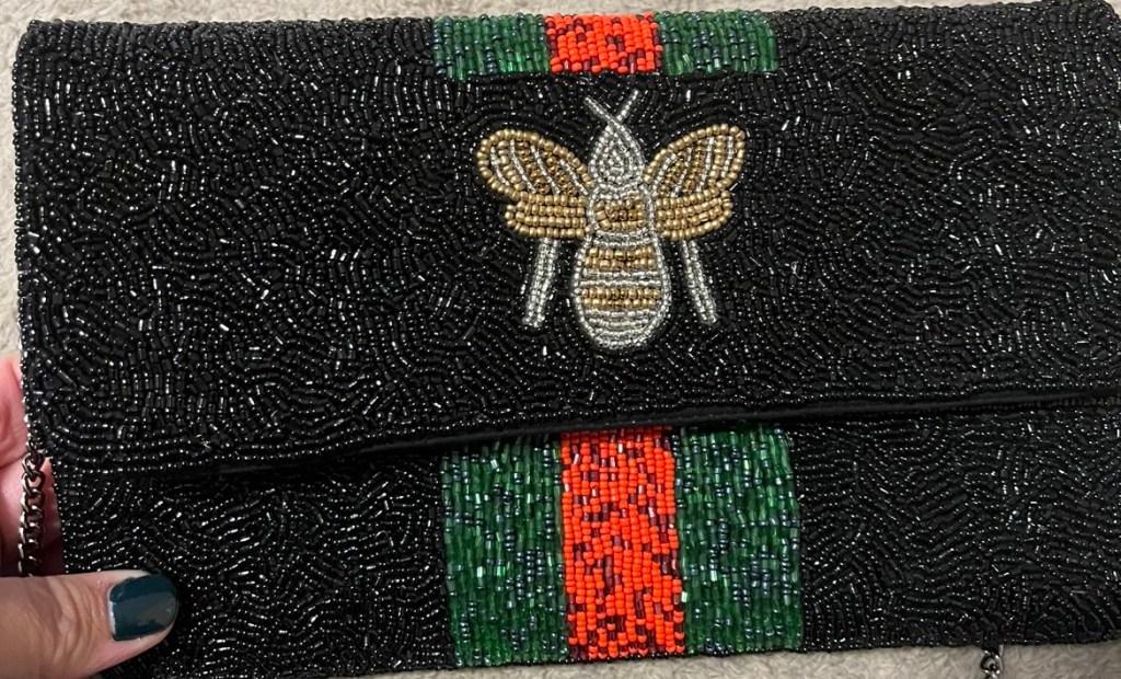 I am also enjoying my new clutch – it can be used year ’round, but I like the red and green for now, especially!