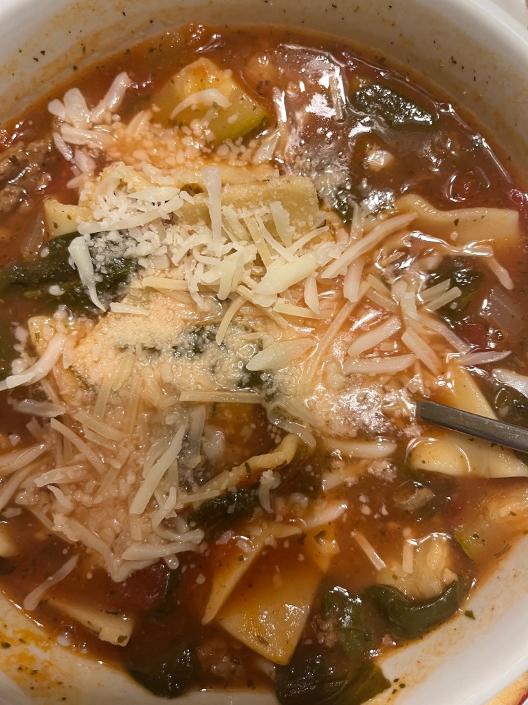 Then, this past Sunday, I did skinny lasagna soup. So good! I added spinach and zucchini.