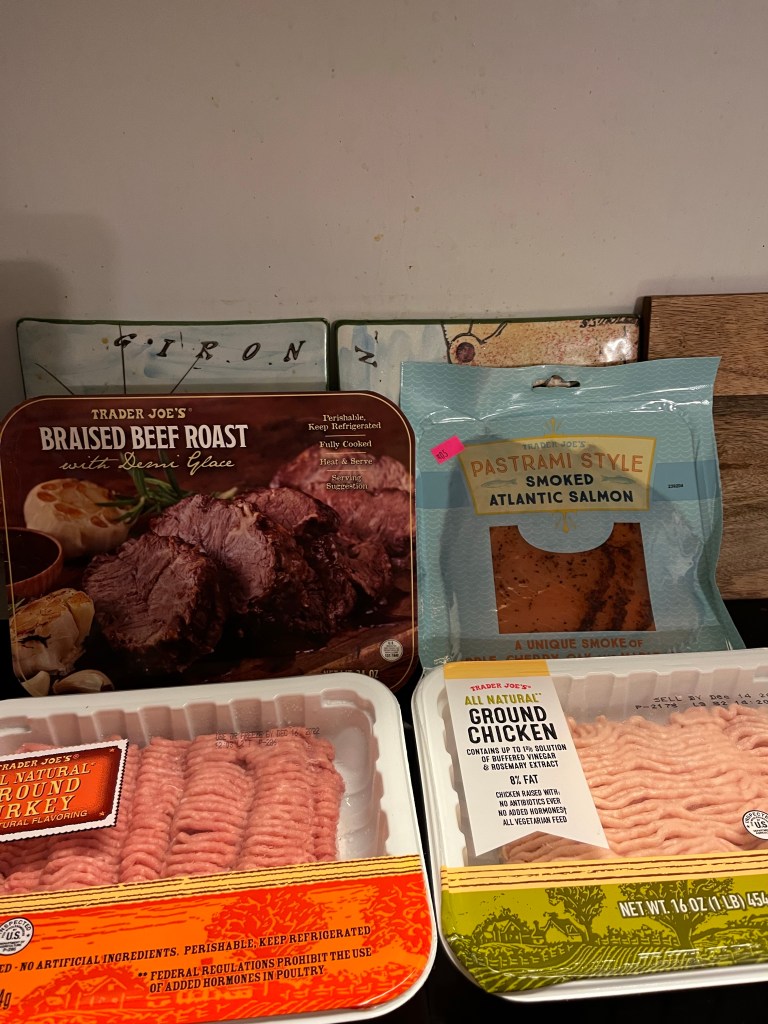 As for meat, I thought a short cut pot roast would be good one night. I will roast carrots, onions, and potatoes in the oven and then heat this up. I got ground turkey and ground chicken for meatballs and then I fell in love with the smoked salmon at the charcuterie place so I am hopeful that TJ’s will be good, too.