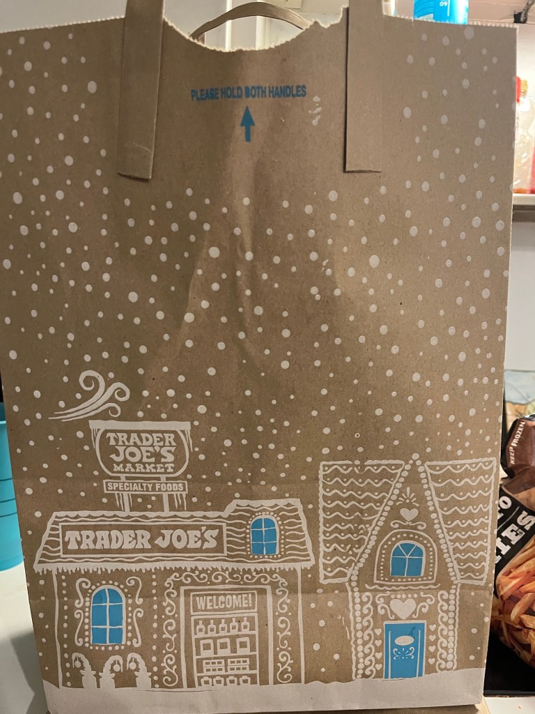 Speaking of frugality, I think this year’s Trader Joe’s bags are so pretty. I might use them to wrap some of my gifts.