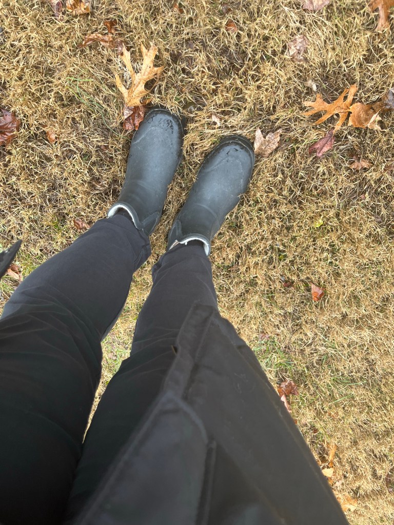 These short, faux sheepskin lined boots from Costco for only $20 have been a fave footwear. I reach for these way more than my Hunters. I wear them without socks and with socks. I wear them in all four seasons.I really believe in a short rainboot. I sometimes wear these to work in bad weather and bring a change of footwear. I think everyone needs something like this. These are also comfortable and padded enough for me to take them on a longer Ernie walk.
