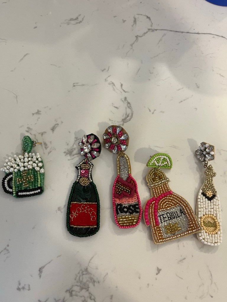My cocktail earrings! I actually read my blog posts from last December/January to see what I was talking about a year ago and that is when I found my first pair in a boutique. My first pair was the second from the left that say “prosecco”. These earrings have been so fun for me this year. I have also given them as gifts. They are in most of my little local boutiques and they are also on Amazon.